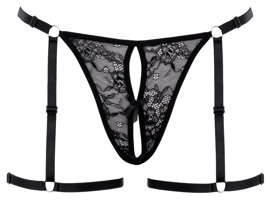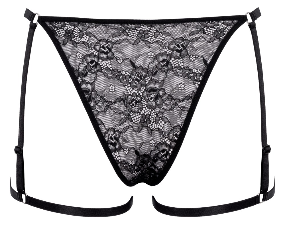 Denne strømpeholder-trusse kombinerer stilfuld femininitet med uimodståelig charme. Den syndigt smukke blonde-trusse begejstrer med sin sensuelle slids foran, der er pyntet med en delikat satinsløjfe. Derudover har den strømpeholdere og stropper som attraktivt pynt på lårene. Alt kan justeres, så det passer perfekt til dig. Og de elastiske, bløde materialer giver dig højeste bærekomfort. Nyd denne erotiske elegance i alle dine uforglemmelige øjeblikke!