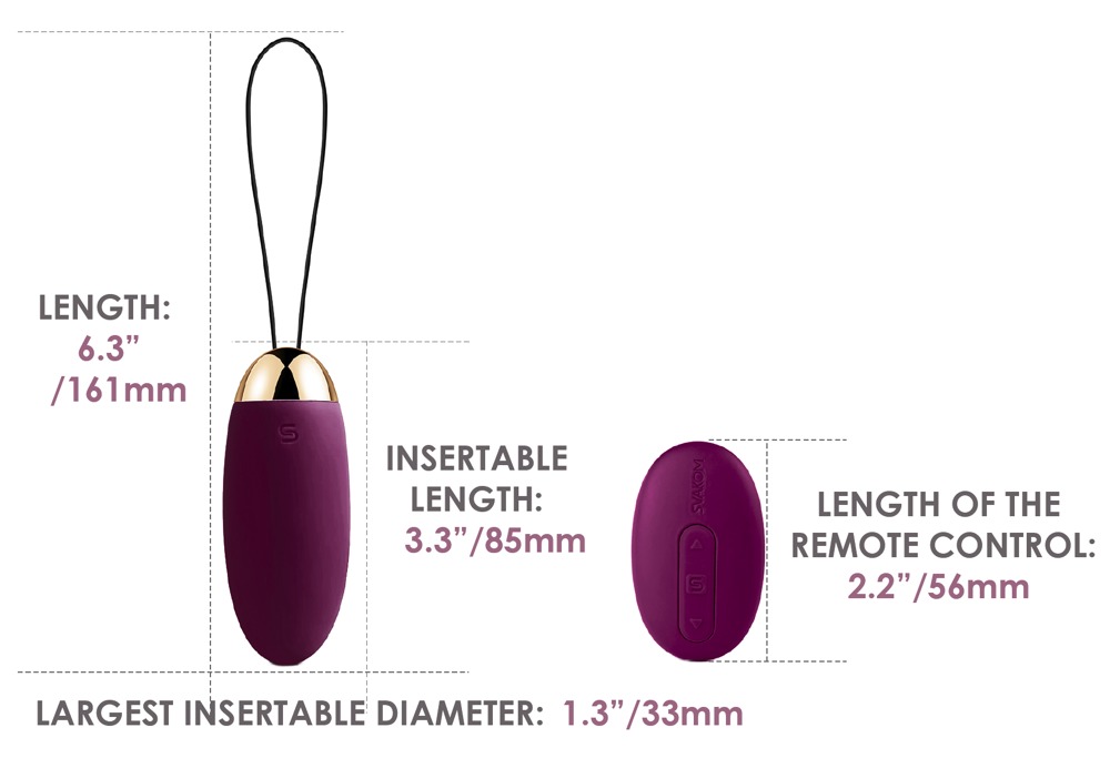 Samlet længde 17,6cm (inklusive tilbagehentesnor), vibroæg 8,1cm, Ø 3,2cm. Silikone med PU-coating, ABS.